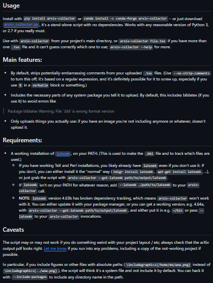 A little Python script to collect LaTeX sources for upload to the arXiv. Install with pip install arxiv-collector or conda install -c conda-forge arxiv-collector, or just download arxiv_collector.py, it's a stand-alone script with no dependencies. Works with any reasonable version of Python 3, or 2.7 if you really must.