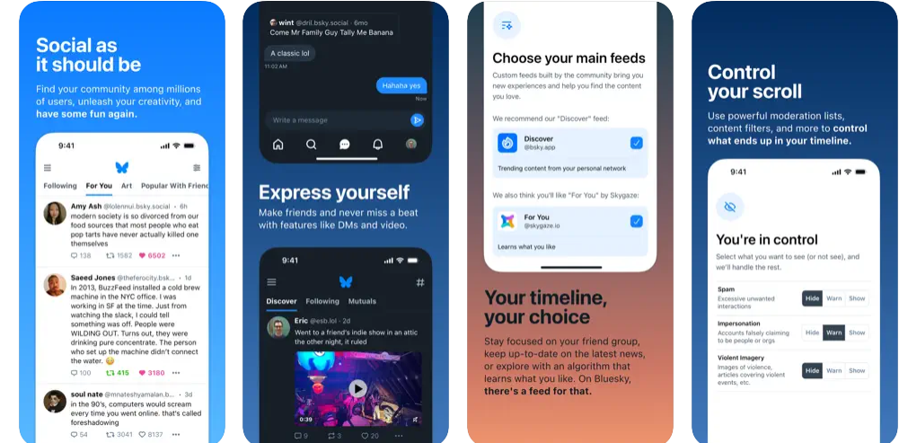 Bluesky Social App is an open-source social networking platform built on decentralized protocols, promoting user control and interoperability. News, jokes, gaming, art, hobbies, and whatever you're into is happening here. Short text posts make for a quick read during coffee, an easy way to wind down the day, or a great way to get connected to your community. Follow your favorite posters or pick from one of the 25,000 feeds to find your people. Join millions of users to be part of the moment and have some fun again.