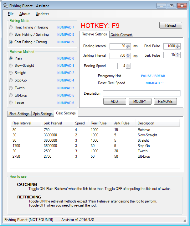 A small tool to help perform different types of fishing retrieval methods of the game Fishing Planet. This will help you catch fishes with its retrieving and catching capabilities.