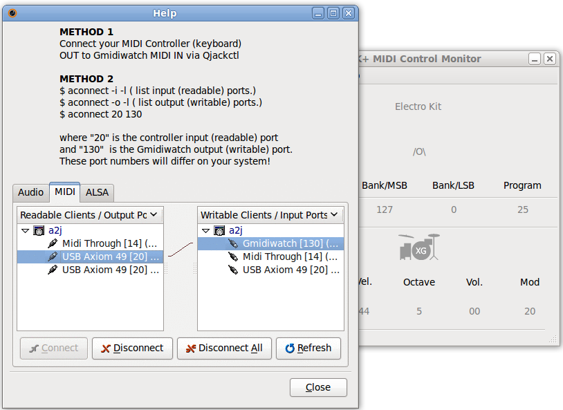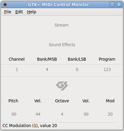 GTK+ GM (General MIDI) Monitor for GM GM2 XG and GS events and instruments. A simple monitor that can be connected through QJackCtl or aconnect to monitor General MIDI Instrument names. Useful for USB MIDI keyboards that lack a display.