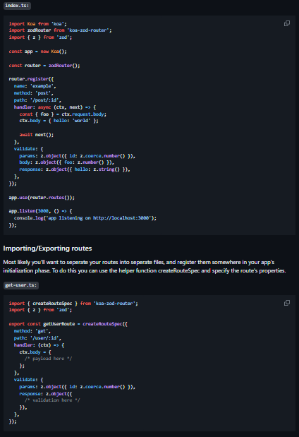 Inspired by koa-joi-router, this package aims to provide a similar feature-set while leveraging Zod and Typescript to create typesafe routes and middlewares with built in I/O validation.