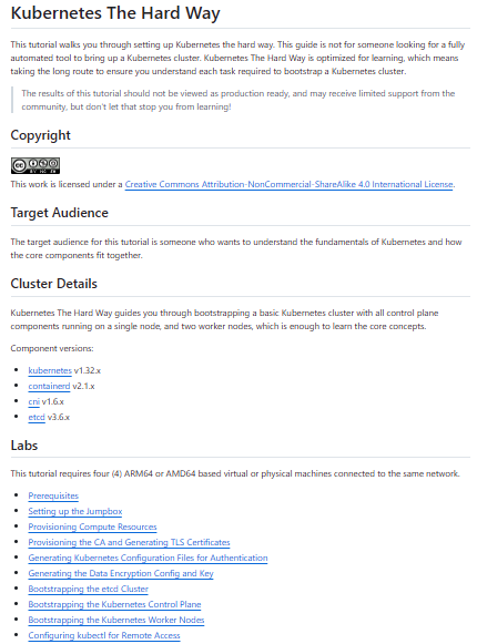 Kubernetes The Hard Way is a hands-on guide to building a Kubernetes cluster from the ground up without using automation tools—no managed services, no scripts to hide the details. It walks you through every component: provisioning compute resources, generating TLS certificates, configuring etcd, bootstrapping the control plane, joining worker nodes, setting networking, and verifying everything works. The purpose is educational: by doing each step manually, you gain deep insight into how Kubernetes works under the hood—control plane components, kube-configs, networking, encryption, etc. The guide isn’t meant for production use; rather it’s a learning tool to build foundational understanding before using higher-level platforms. You’ll learn about certificate management, API server flags, etcd clustering, kubelet boot sequence, and how pods route traffic across nodes. Many practitioners use it to prep for Kubernetes certifications or deeply understand Kubernetes internals.