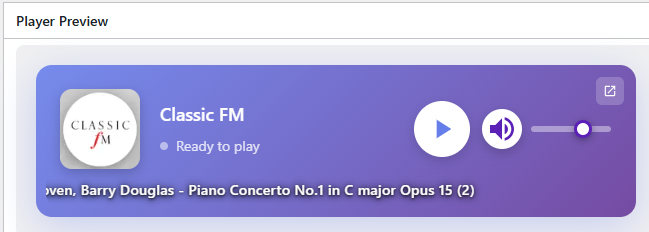 Stream BBC Radio, internet stations, play podcasts, or your own broadcasts with stunning glassmorphism effects, per-station styling, and full HLS support. Create unlimited stations with custom artwork, dark mode, and gradient colors. You can even create unlimited sticky radio players.