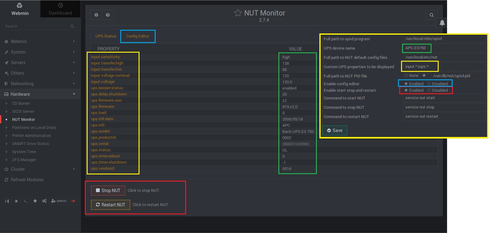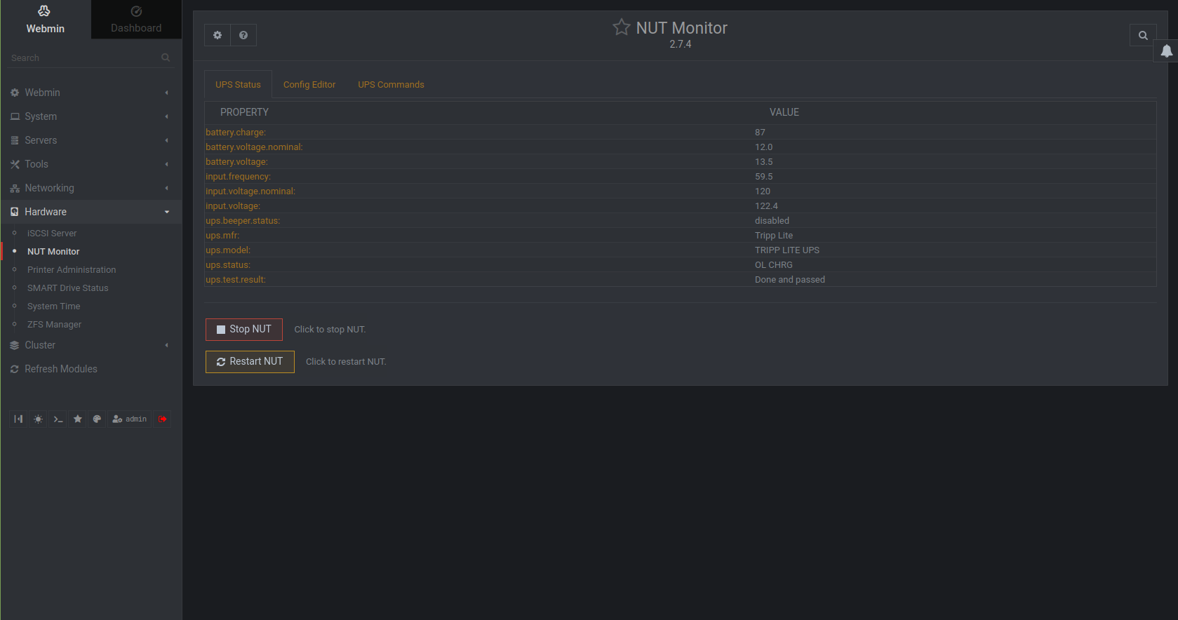 NUT Monitor Webmin module, this simple module generates an UPS status summary within Webmin, as well as for basic management, the module supports FreeBSD based distros, also added initial/experimental support for Linux distros.