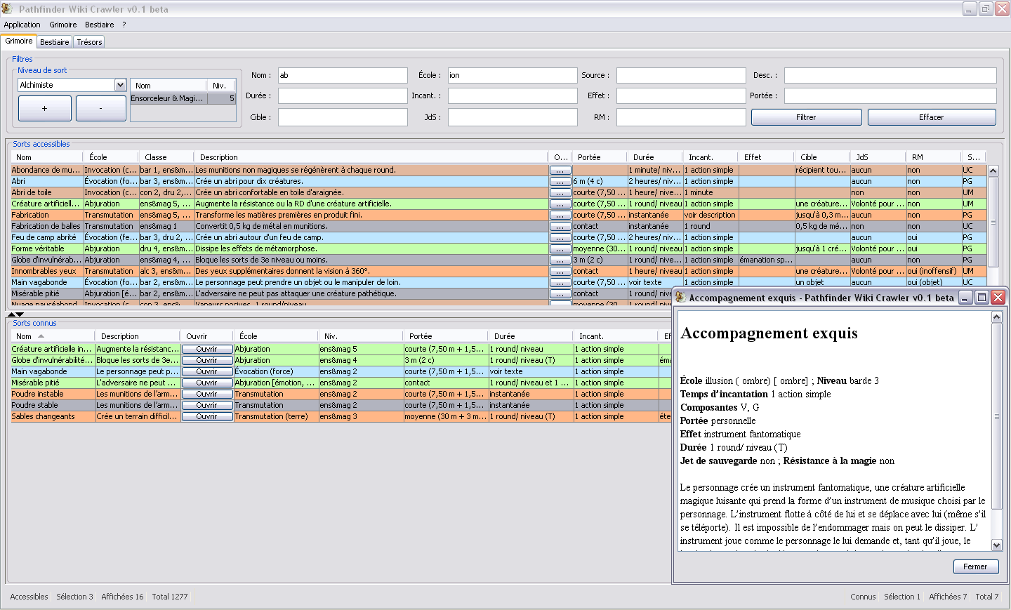 Le logiciel permet aussi la création de liste de sorts détaillé, d'exportation de de chaque type de données.