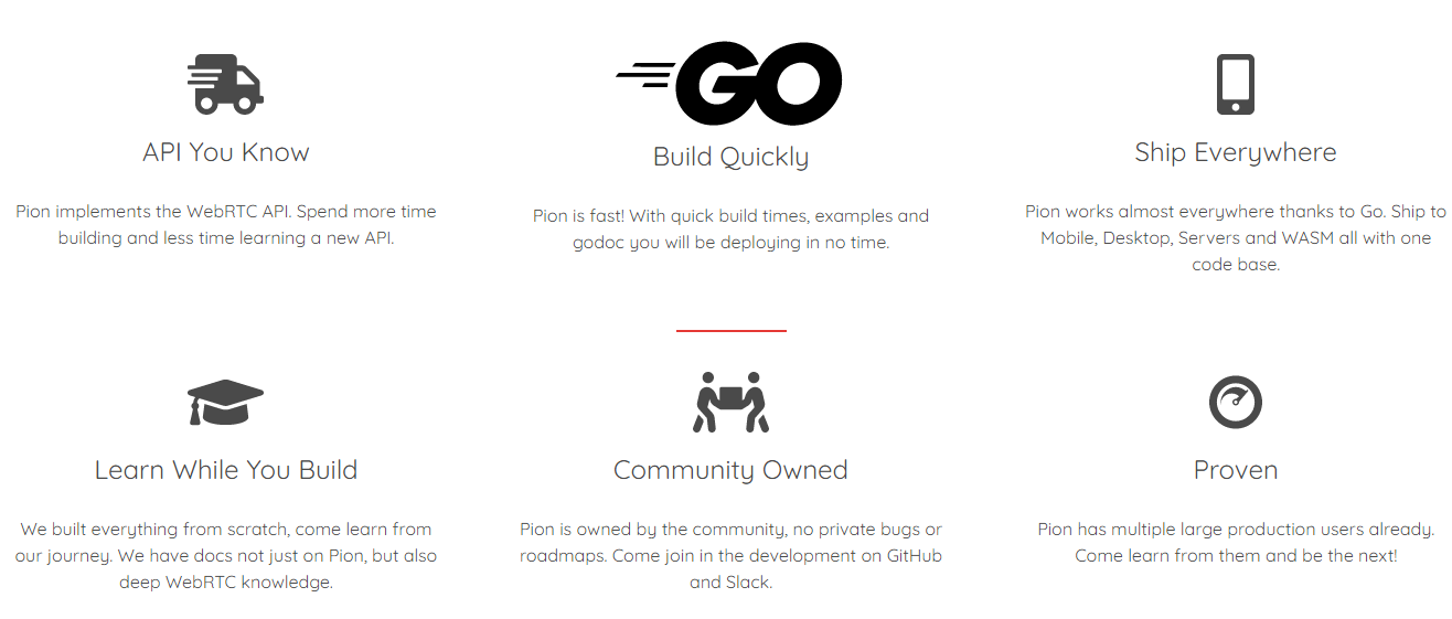 Pion implements the WebRTC API. Spend more time building and less time learning a new API. Pion is fast! With quick build times, examples and godoc you will be deploying in no time. Pion works almost everywhere thanks to Go. Ship to Mobile, Desktop, Servers and WASM all with one code base. We built everything from scratch, come learn from our journey. We have docs not just on Pion, but also deep WebRTC knowledge. Pion is owned by the community, no private bugs or roadmaps. Come join in the development on GitHub and Slack. Pion has multiple large production users already. Come learn from them and be the next! Example applications contains code samples of common things people build with Pion WebRTC. Example-webrtc-applications contains more full featured examples that use 3rd party libraries.