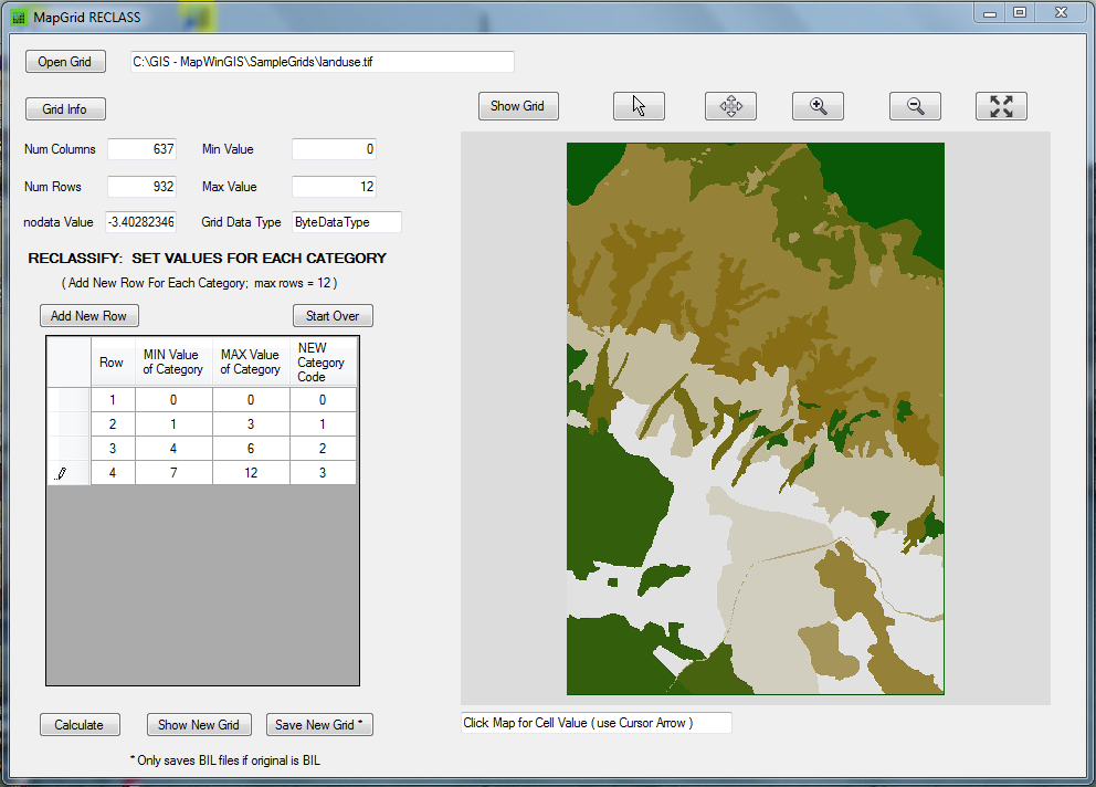 Map grids (raster maps) can be easily reclassified with this Windows-based stand-alone program. It displays the original grid, provides basic information on cell values, and displays and saves the reclassified grid. It opens and saves tif, asc and bil formats.
