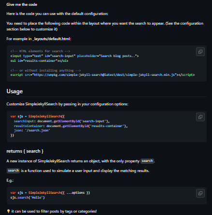 - Customize SimpleJekyllSearch by passing in your configuration options